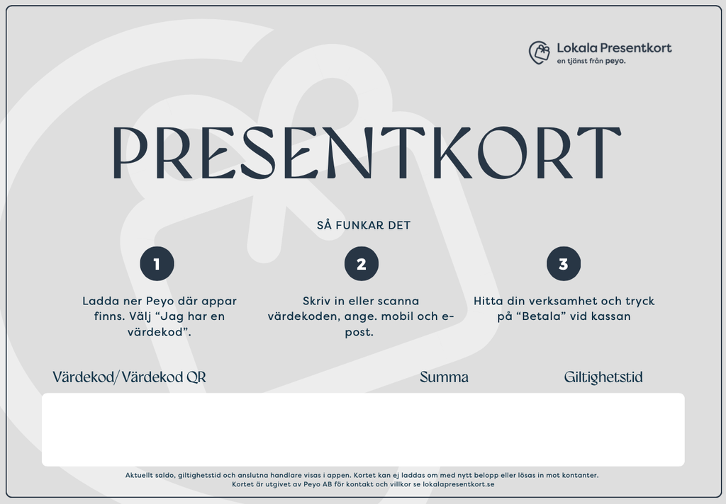 Presentkortet levereras som en smidig värdekod, som enkelt löses in via Peyo-appen. Därefter kan mottagaren handla i alla de butiker, restauranger, caféer och andra verksamheter som är anslutna i Västervik. När du har gjort din beställning, får du koden, instruktioner och en utskrivbar bild direkt till din mail. Har du ingen skrivare? Inga problem! Du kan skriva koden på vilket grattiskort du vill. Gör någon glad med en present som gör skillnad – ett smart, enkelt och hållbart val!